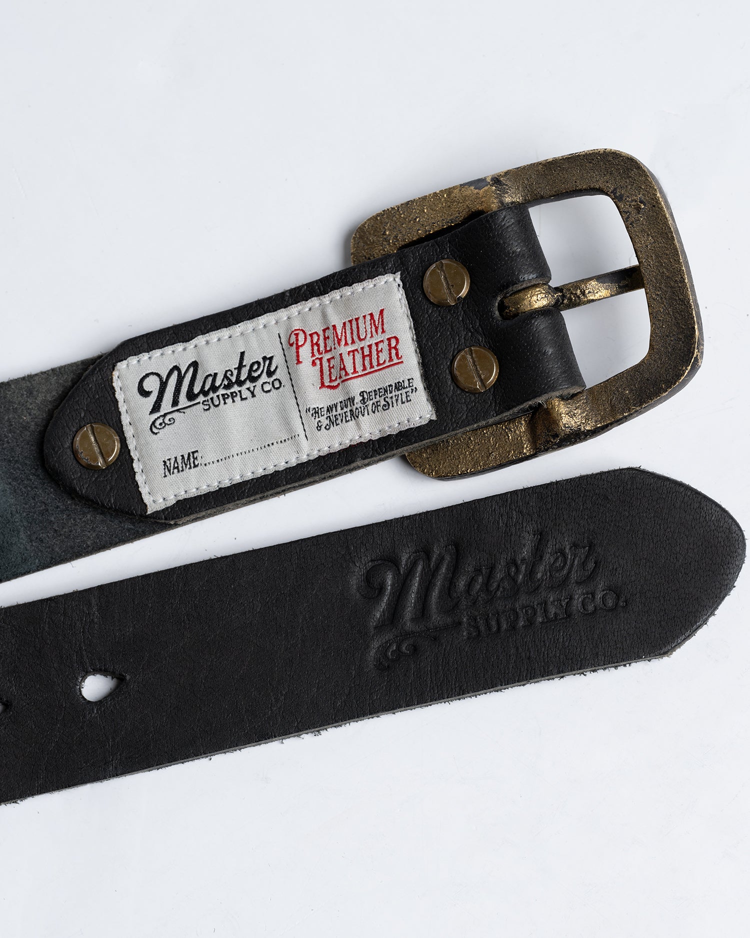 Crafted for the long haul, our Master Supply Co leather belts are a rugged and versatile addition to your collection. Made from 100% vegetable-tanned buffalo leather, these belts boast a robust 4.2mm thickness, ensuring durability and longevity. The solid brass hardware is built to last, while the Master embossed adds subtle branding.