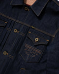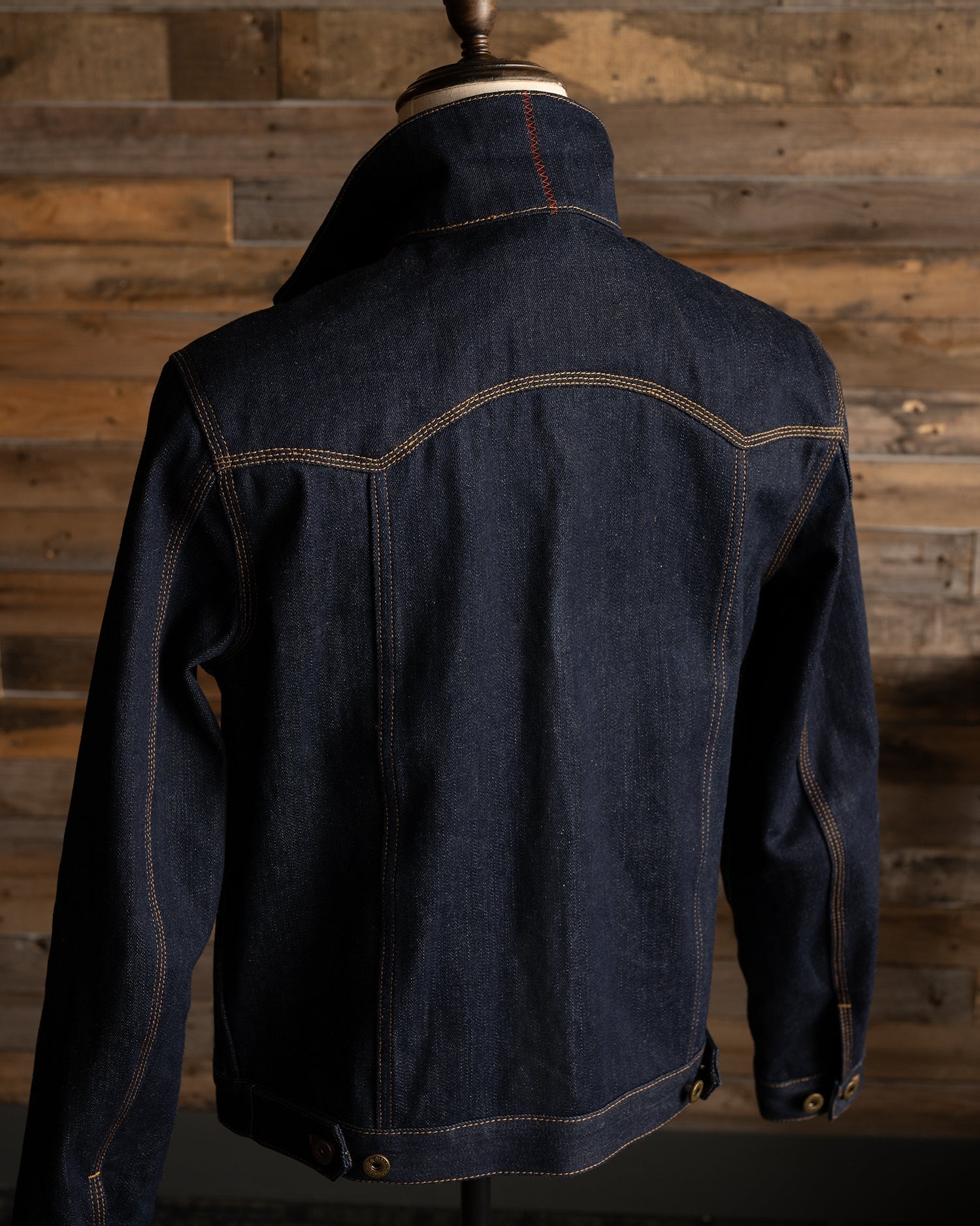 This 17 oz selvedge denim is raw and unwashed, with deep indigo saturation and a smoother hand feel thanks to its left-hand twill weave. Woven slowly on mid-century shuttle looms, each yard of fabric carries unique character and subtle irregularities that modern high-speed looms can’t replicate. Sanforization minimizes shrinkage while preserving the integrity of the break-in process. The red-line selvedge ID is a nod to denim’s heritage—and a marker of the slower, deliberate craft behind each jacket.