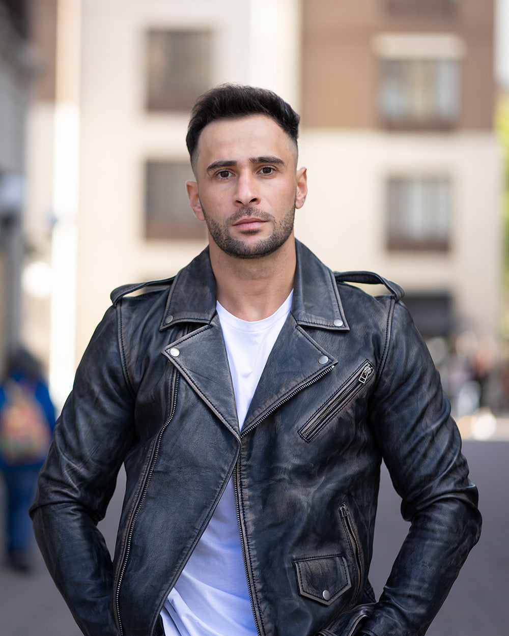 - Details : Distressed finish on leather, Shoulder epaulettes