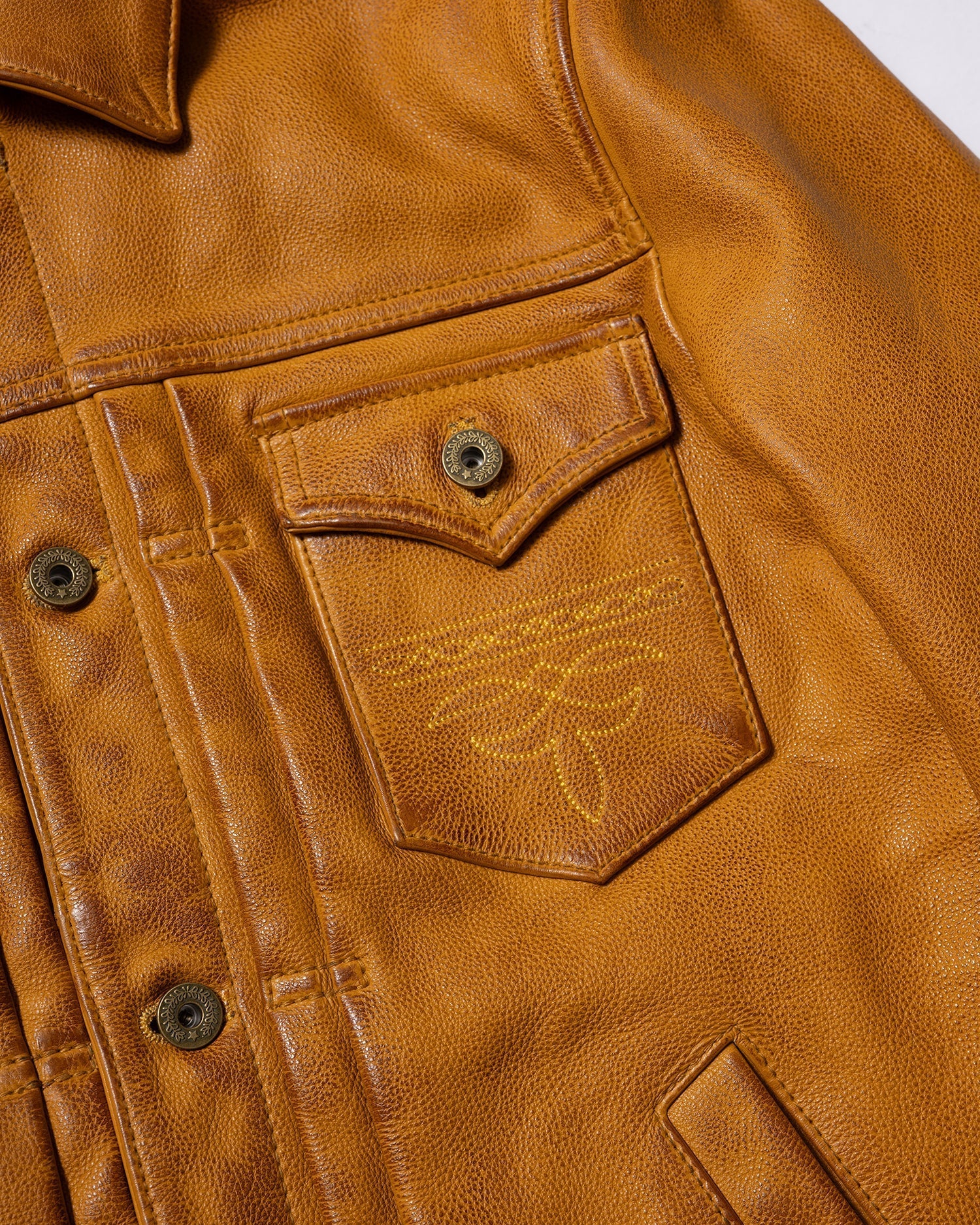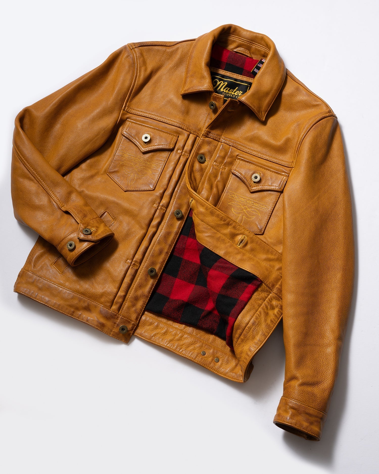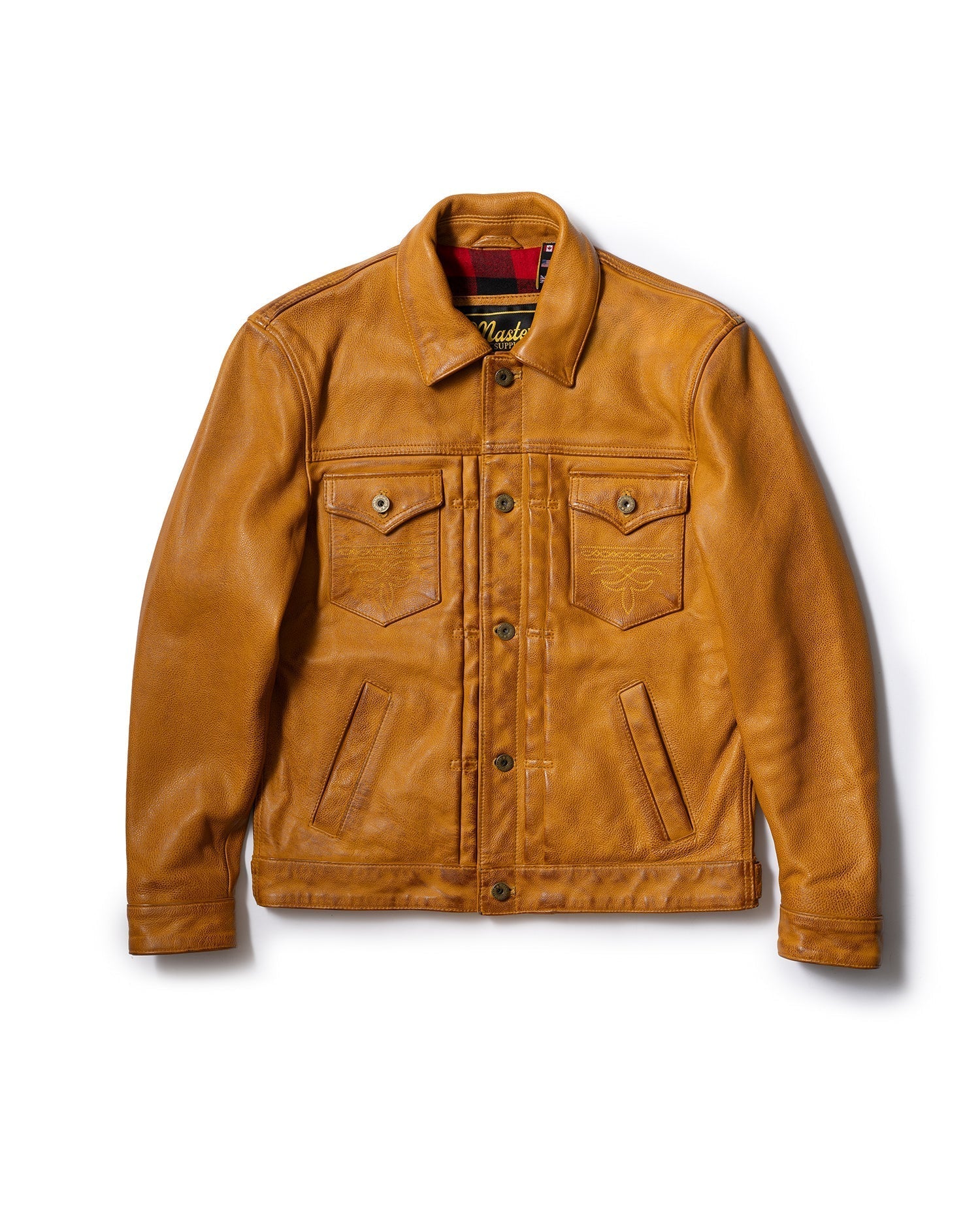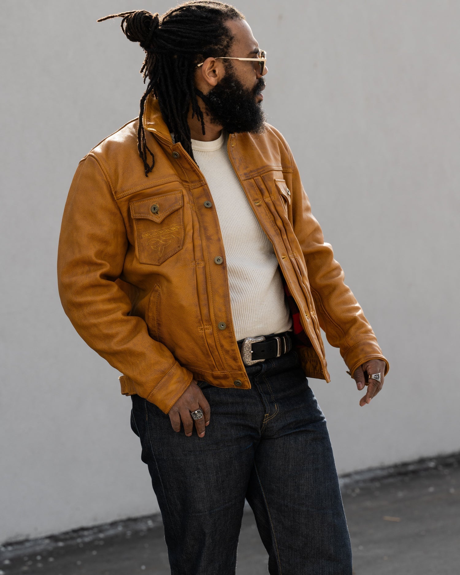 The Goldrush Leather Jacket takes its cues from classic 1960s trucker jackets, featuring pleated front panels, a four-pocket layout, and subtle western touches on the flap chest pockets — all interpreted through Master Supply Co.’s rugged, heritage-driven lens.