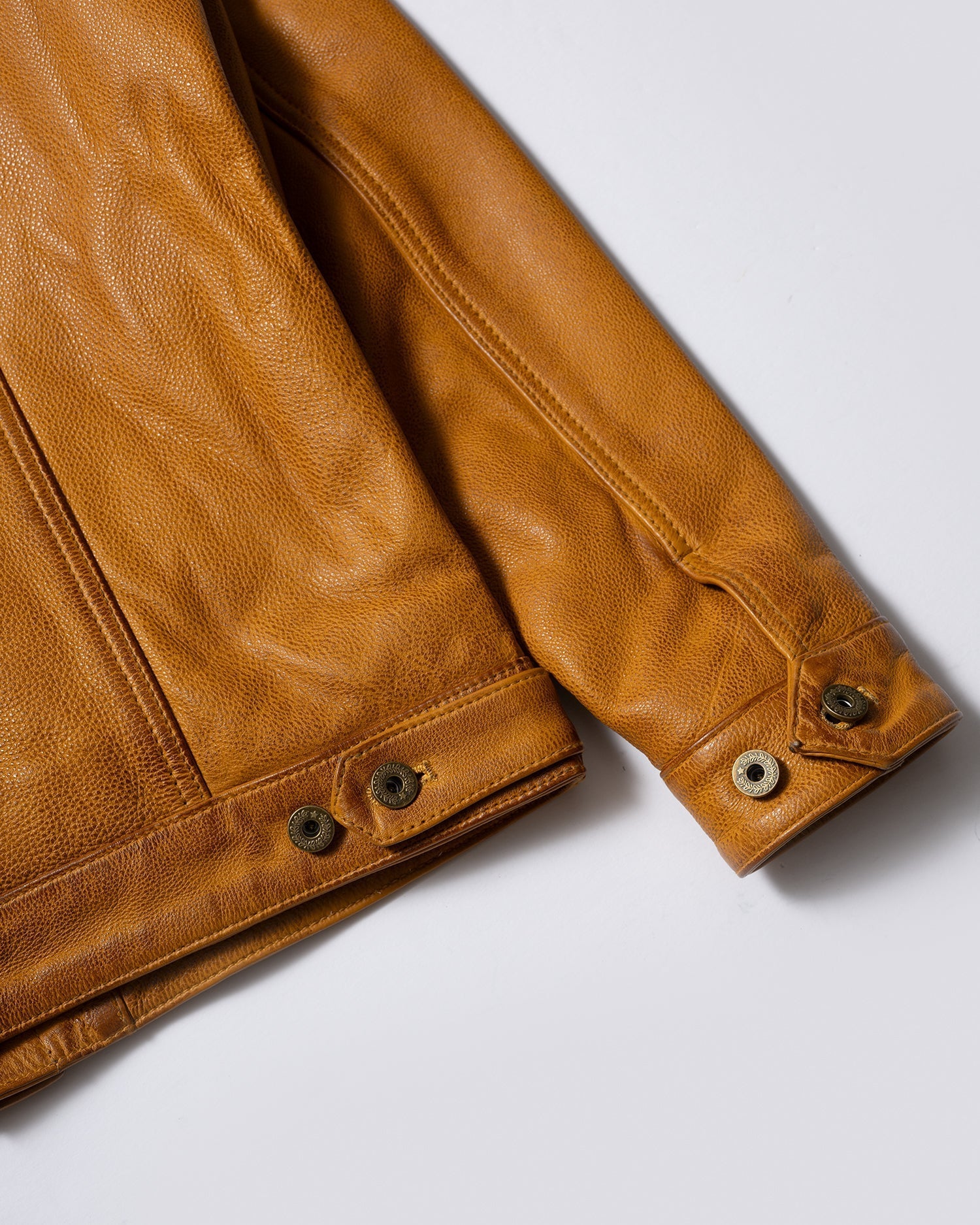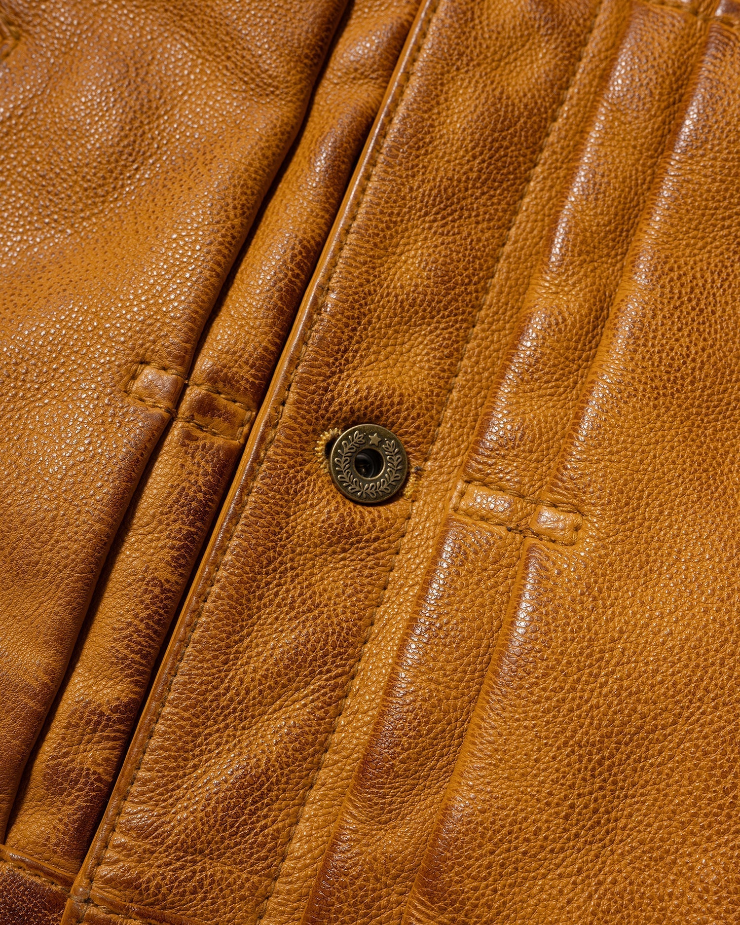Crafted from full-grain, semi-vegetable tanned cowhide, the Goldrush is finished with a light application of a proprietary European wax treatment, typically reserved for high-end leather goods. Applied by hand in small batches, this oil-wax process isn’t meant to simulate wear; it’s done to enhance the jacket’s elemental protection and draw out the natural character of the leather. The early tonal shifts and variation in the finish come from this reaction—not from artificial distressing or pre-worn effects.