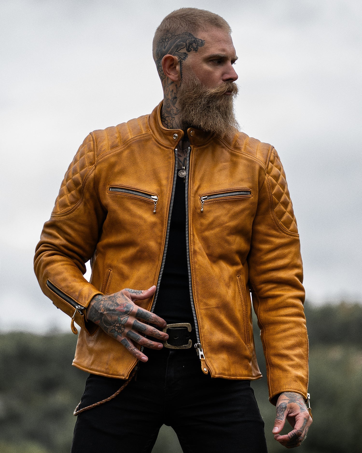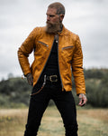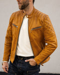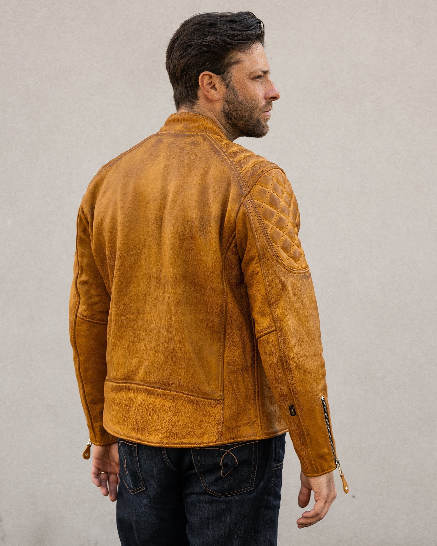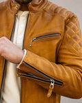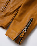 The Grand Prix jacket breathes new life into the classic racer style with a bold update to our design. Inspired by the thrill and resilience of race culture, this jacket is crafted from our premium gold semi-vegetable tanned cowhide leather, combining durability with character to ensure it stands out both on and off the road. The leather is oil-waxed, enhancing its appearance without distressing it. This process adds a slightly darker, weathered tone, giving the leather natural contrast and providing additional protection against the elements—ideal for those who desire an authentic look without a mechanically distressed finish.