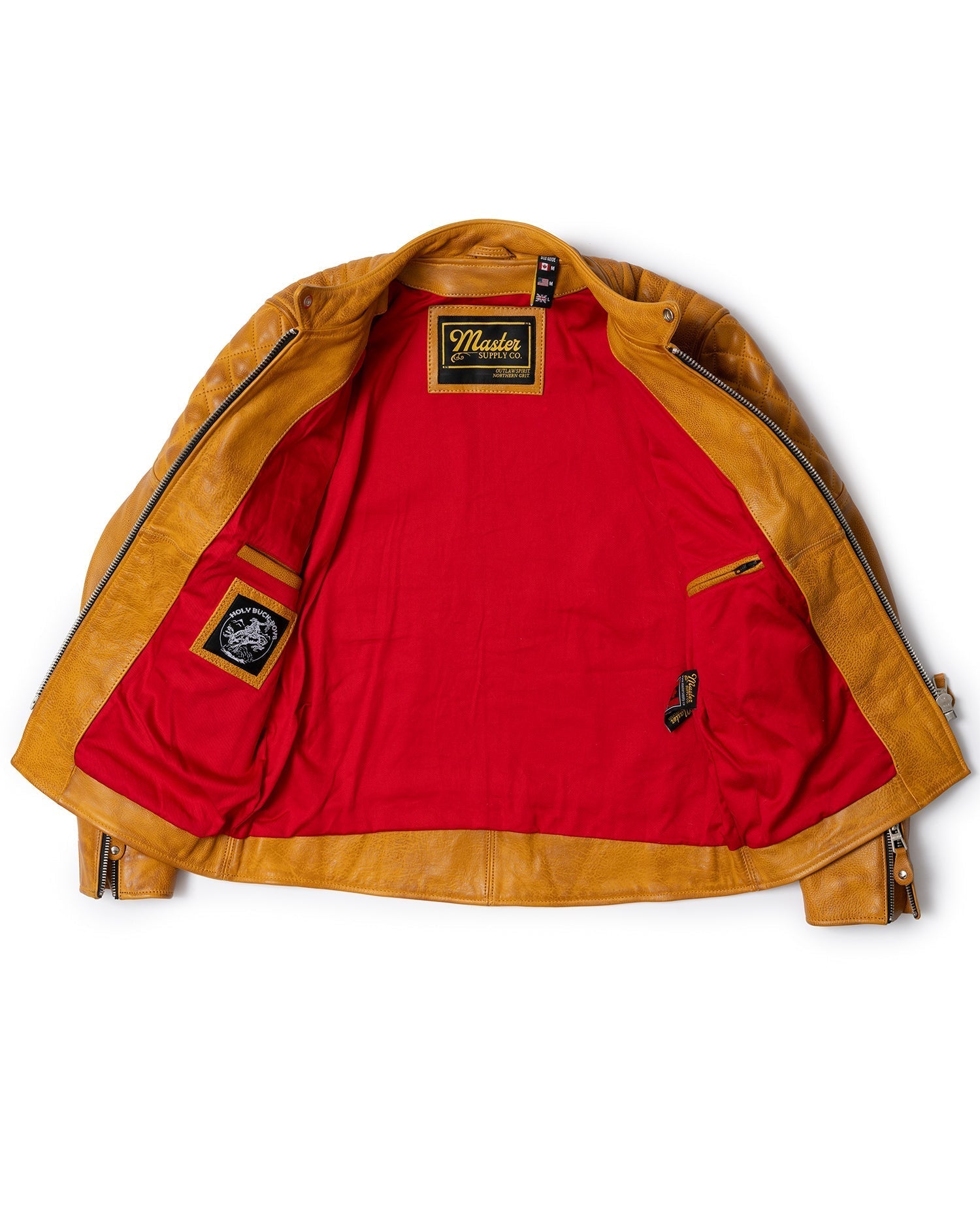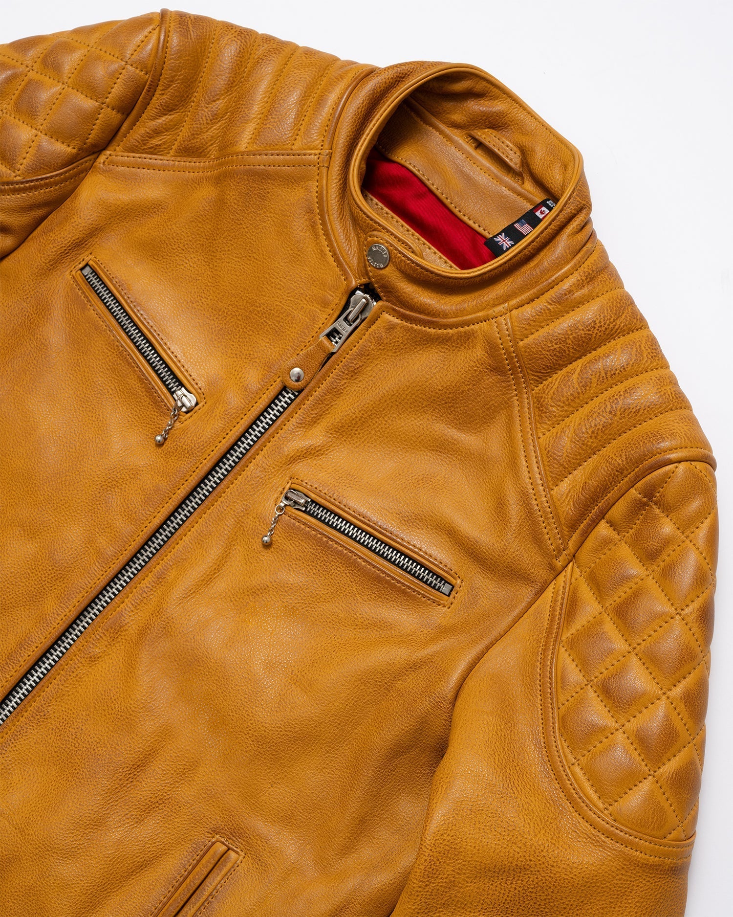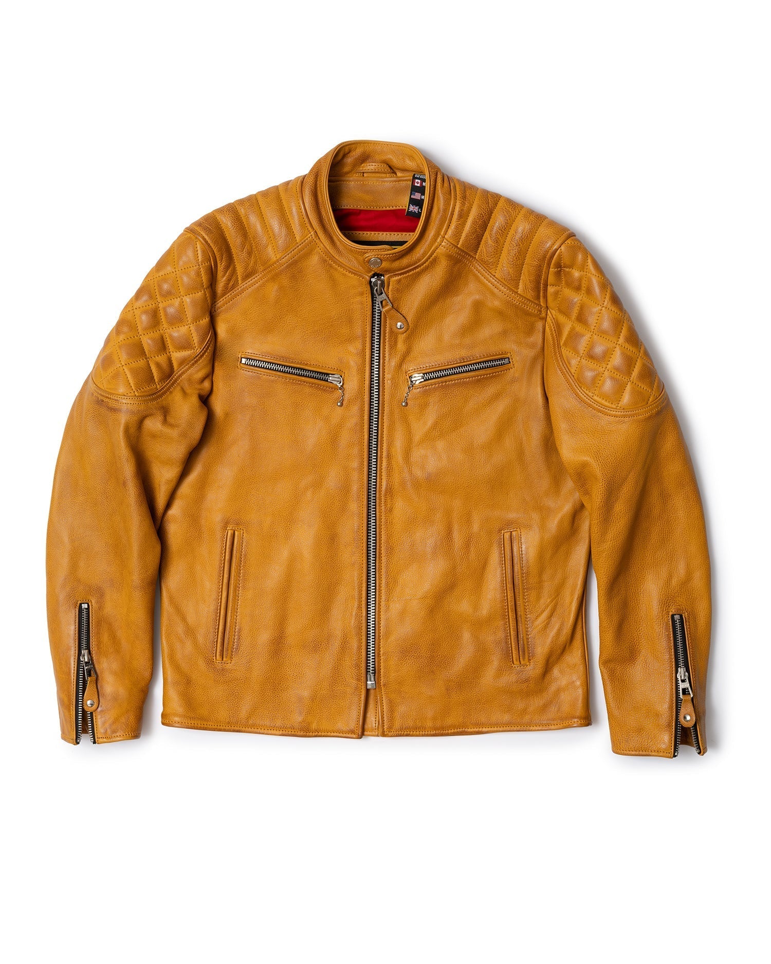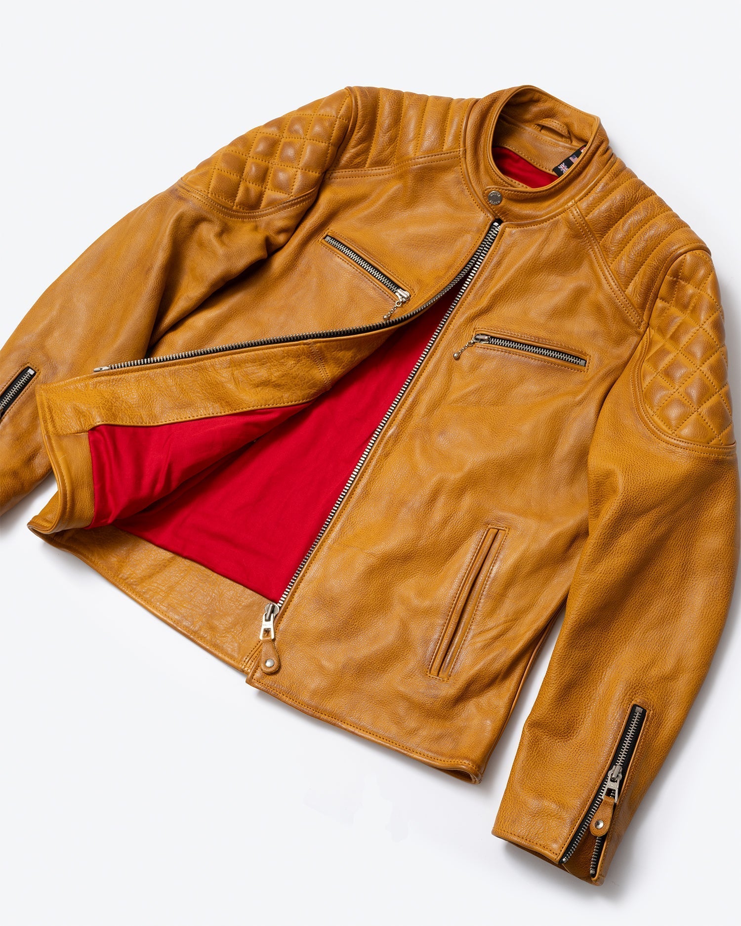 Inside, you’ll find a vibrant red twill liner that contrasts with the gold leather exterior, along with two interior pockets for added functionality. The center snap collar completes the race-inspired look, making this jacket as stylish as it is practical.