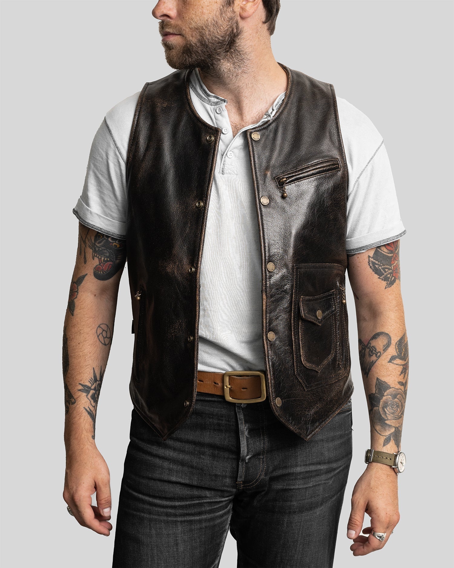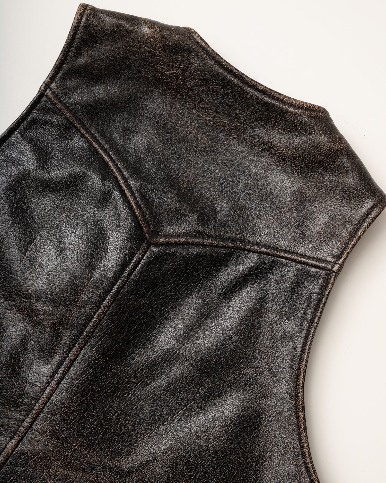 Made from premium Accelerust buffalo leather with a vintage treatment, this vest is all about character and durability. As time goes by, the leather will age gracefully, revealing its unique patina.
