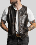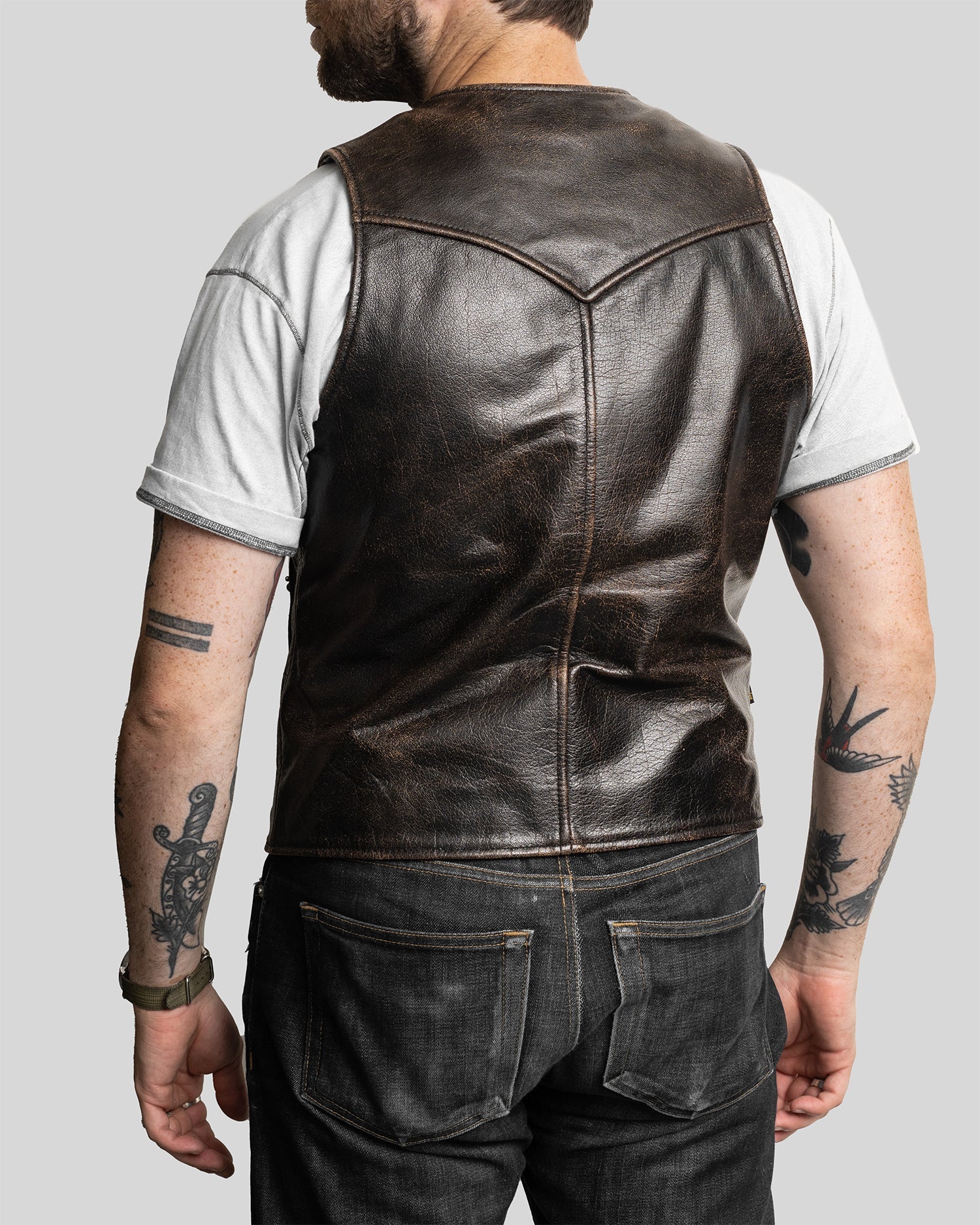 Introducing our Guardian Leather Vest - a true heritage-inspired piece based upon our beloved Gunslinger silhouette. This rugged vest is designed for those who appreciate classic Western cuts and the unfiltered rawness of the American motorcycle culture.
