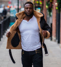 B-3 bomber jacket is a timeless heavyweight shearling, modeled after the original WWII shearling jackets