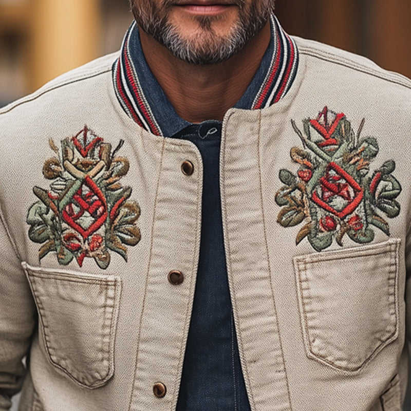 The standout feature of this jacket is its intricate embroidery, which showcases craftsmanship and attention to detail. The embroidery adds a touch of personality, setting this jacket apart from standard outerwear. Designed with a modern fit, it drapes elegantly on the body while remaining comfortable enough for everyday wear. Pair it with jeans or chinos, and you'll effortlessly achieve a chic and stylish look.