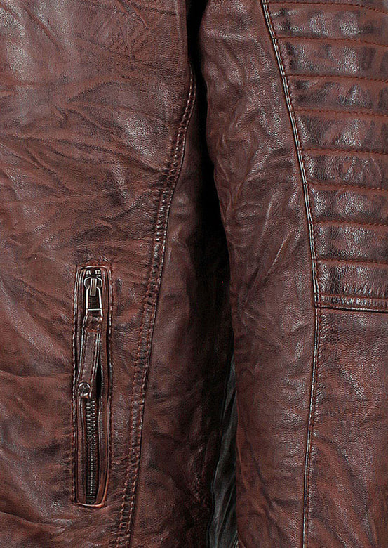 This stylish brown café racer leather jacket with salavat wrinkled texture will keep you warm and stylish. This jacket's inner lining is made of Taffeta Polyester, and it has a snap-style collar that adds a more modern touch. This jacket has three exterior pockets and two interior pockets, zippered closure, and zippered cuffs which make it well worth the price.