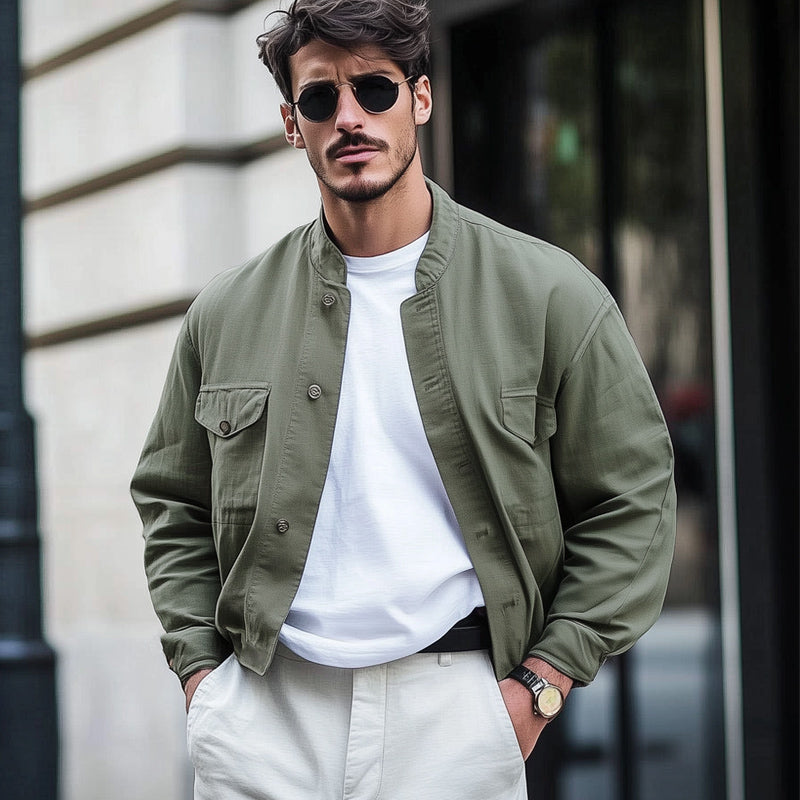 Prepare your wardrobe for transitional weather with the Men's Spring and Autumn Army Green Short Work Jacket. A tribute to classic workwear boiled down to a contemporary style, this jacket is perfect for navigating the changing seasons with ease and flair. The army green hue exudes an effortlessly rugged charm, making it an adaptable piece for various occasions, whether you're heading to the city or exploring the great outdoors. With its focus on both fashion and function, this jacket is a staple for any man's collection who values style and practicality.