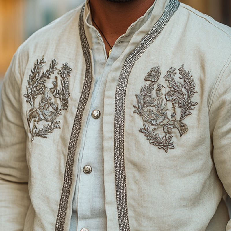 Step into the new season with confidence and style, wearing the Men's Spring Cotton and Linen Embroidered Jacket. Its refined elegance and comfortable fit make it an essential piece for any fashion-forward individual looking to enhance their wardrobe with a touch of embroidery artistry.