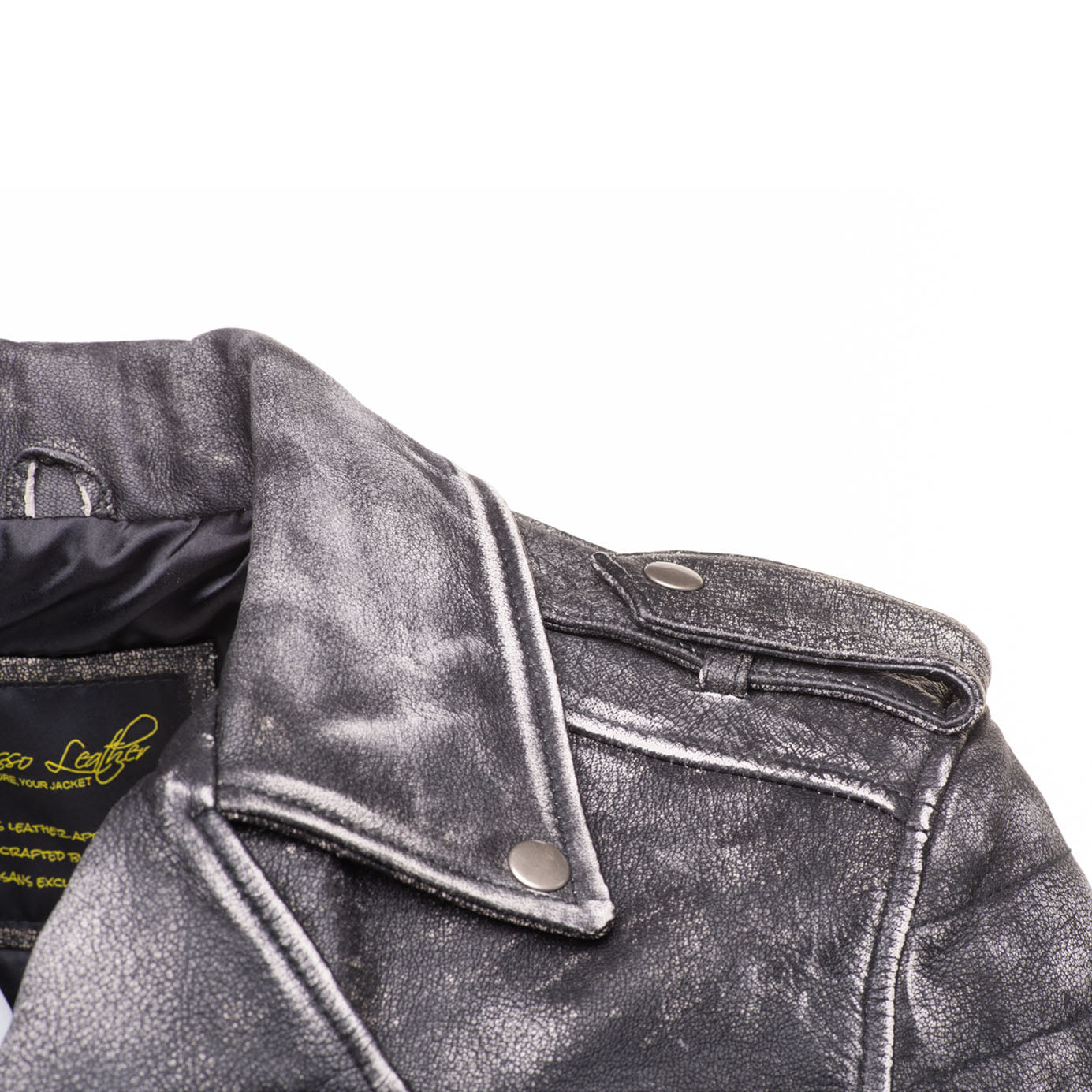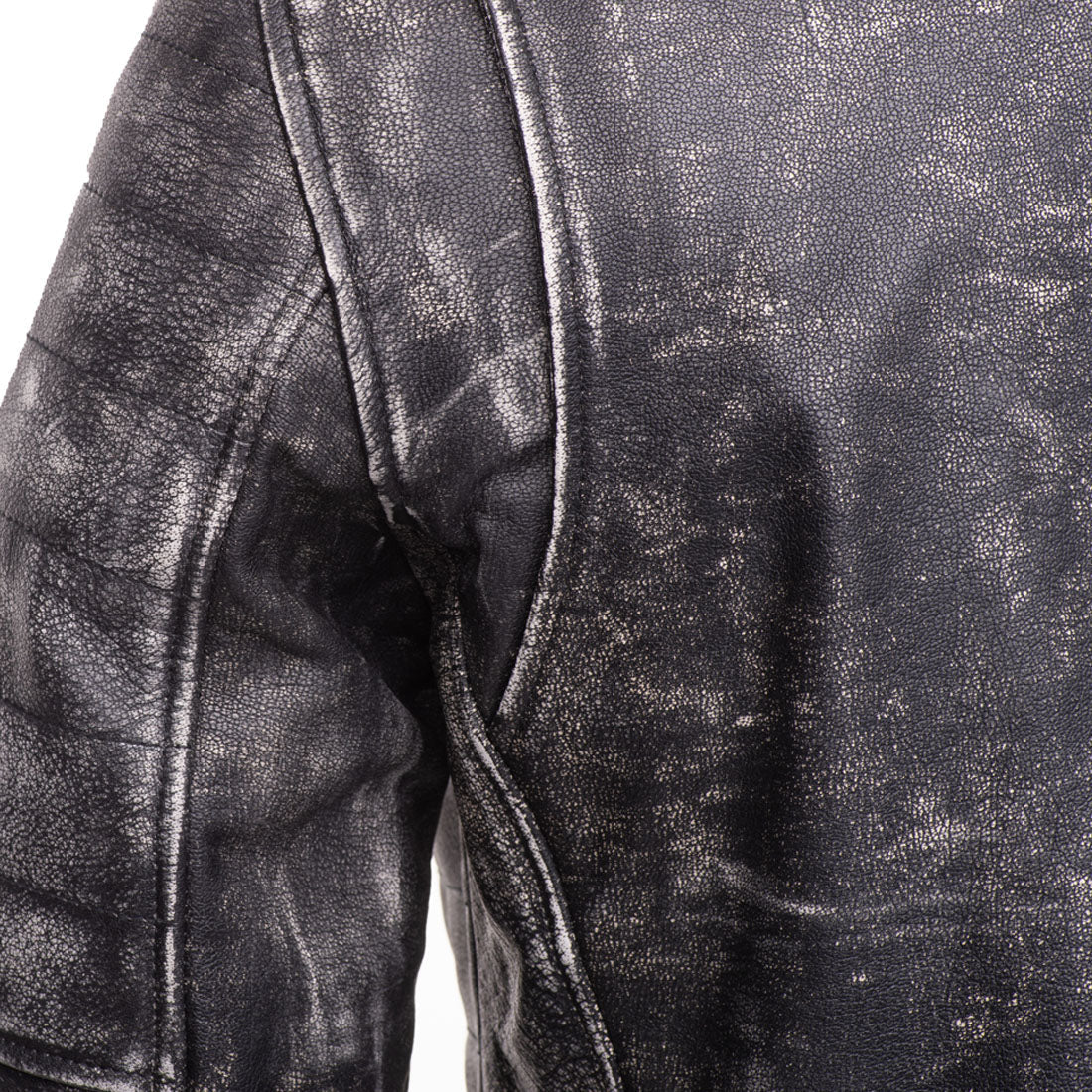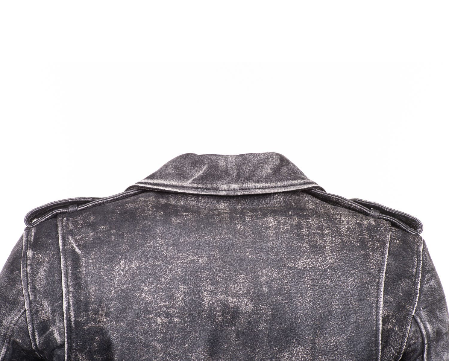 - Details : Distressed finish on leather, Shoulder epaulettes