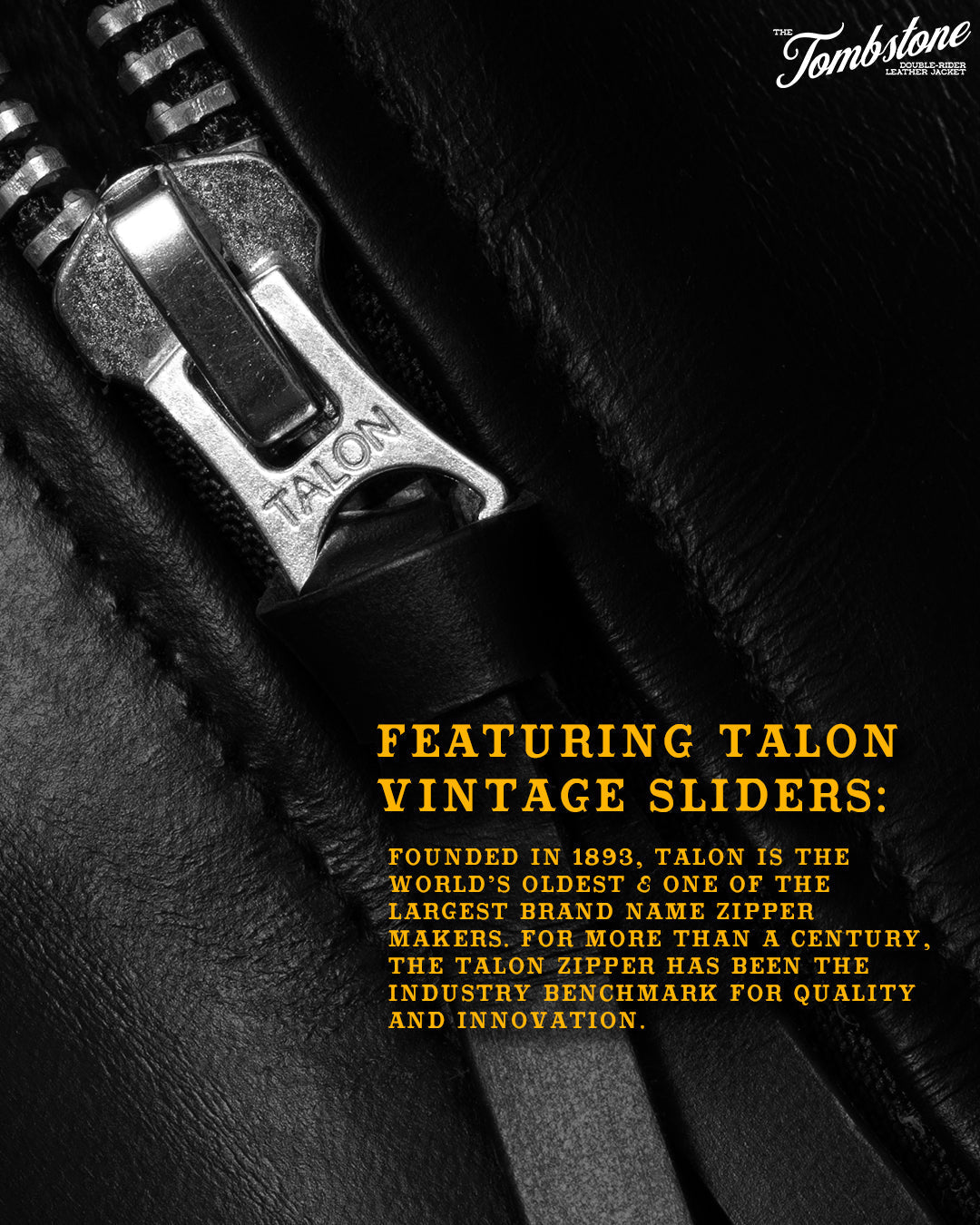 Introducing The Tombstone, our refined take on the classic double rider jacket, now enhanced with authentic Talon vintage sliders—a hallmark of quality since 1893.